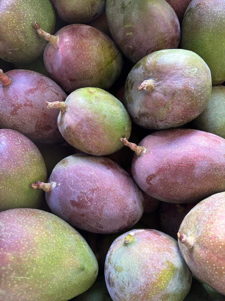 La manga es una fruta tropical, dulce y jugosa que aporta múltiples vitaminas, fibra y propiedades nutritivas. Tiene una pulpa suave y apenas sin hebras, a diferencia del mango. Su tamaño es más grande, con una forma ovalada. Al principio su piel es verde y cuando empieza a madurar empieza a tener tonalidades moradas y rojizas.